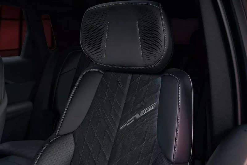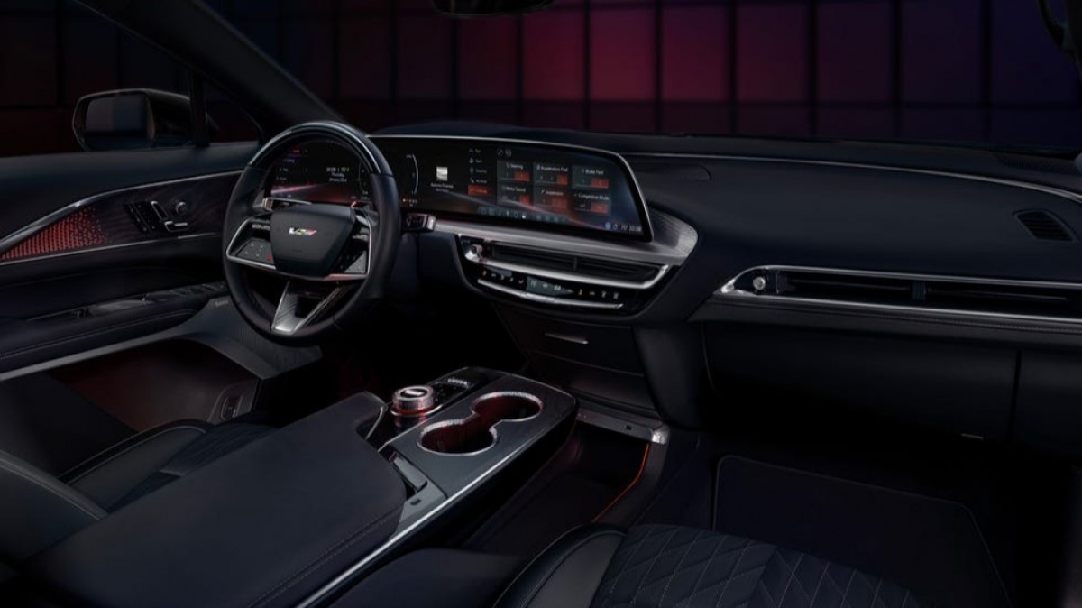 Bên trong khoang lái, Lyriq-V mang đến một chút hơi thở thể thao so với phiên bản Lyriq tiêu chuẩn. Vô lăng được thiết kế riêng với nút V-Mode và lẫy chuyển số Regen On Demand. Ghế ngồi chỉnh điện với phần đệm ôm sát người lái, mang lại sự hỗ trợ tốt hơn khi vận hành ở tốc độ cao. Hệ thống thông tin giải trí cũng có giao diện riêng, phản ánh cá tính của dòng V-Series.