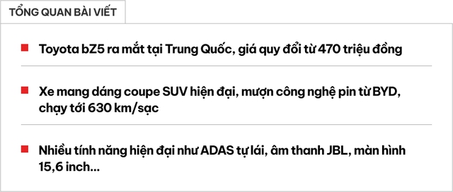 Toyota bZ5, phiên bản sản xuất của mẫu bZ3C từng được giới thiệu tại Trung Quốc năm ngoái, chính thức ra mắt thị trường này. Xe được sản xuất bởi liên doanh FAW-Toyota và có 4 phiên bản khác nhau.
