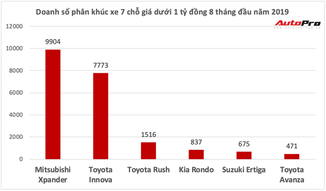 Không chỉ có Ertiga, các mẫu MPV khác cùng phân khúc cũng đứng dưới Xpander trong bảng xếp hạng doanh số với khoảng cách chênh lệch khá lớn. Cựu "vua doanh số" MPV năm 2018 là Toyota Innova sau 8 tháng đầu năm 2019 mới bán được 7.773 xe, ít hơn 2.131 xe so với Mitsubishi Xpander. Xếp dưới nữa là Kia Rondo với 837 xe và Toyota Avanza với 471 xe. Toyota Rush cũng là mẫu xe 7 chỗ cạnh tranh Mitsubishi Xpander và doanh số chỉ đạt 1.516 xe trong 8 tháng qua.