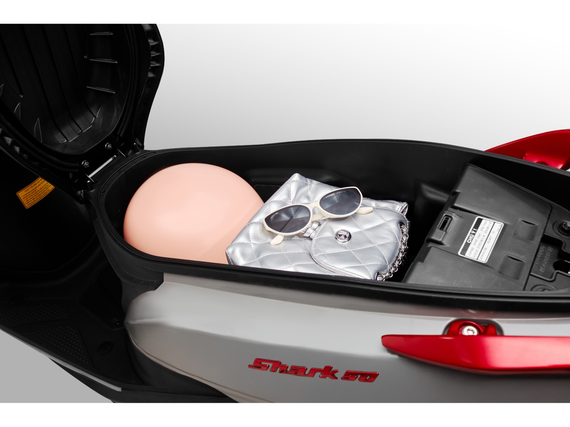 Xe được trang bị đèn pha halogen 35W ánh sáng trắng và đèn xi nhan to bản. Bảng đồng hồ analog truyền thống nhưng hiển thị rõ nét. SYM Shark 50 có cốp rộng rãi, sử dụng chìa khóa cơ và nắp bình xăng phía trước tiện lợi.