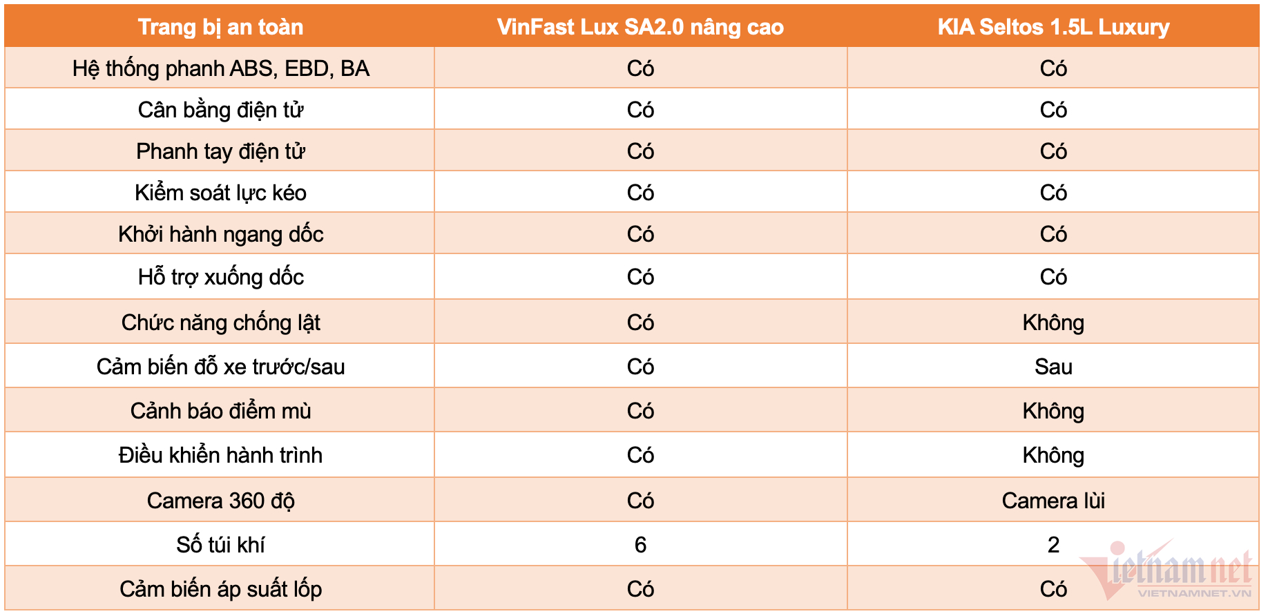Về khía cạnh trang bị an toàn, cả VinFast Lux SA2.0 bản nâng cao và KIA Seltos 1.5L Luxury đều không có các công nghệ an toàn chủ động, hỗ trợ người lái.