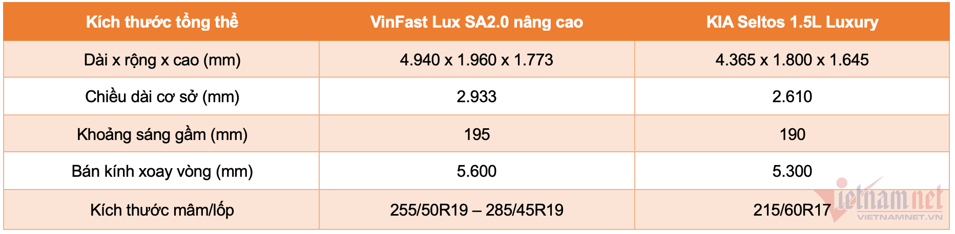 VinFast Lux SA2.0 dài hơn KIA Seltos 575mm, rộng hơn 160mm, cao hơn 128mm và khoảng sáng gầm lớn hơn 5mm. Bên cạnh đó, chiều dài cơ sở của mẫu xe Việt Nam cũng dài hơn 323mm so với xe Hàn. Chính vì vậy mà xét về tổng thể khi đặt cạnh, Lux SA2.0 to hơn đáng kể so với Seltos nhưng cũng vì thế mà bán kính quay đầu của xe cũng lớn hơn, khó xoay sở khi đi trong những cung đường hẹp.