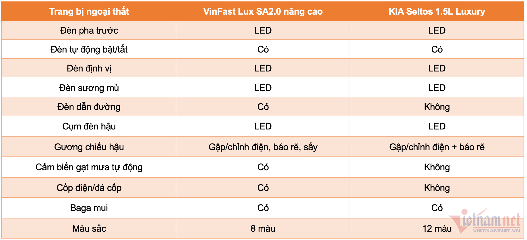 Là mẫu xe thuộc phân khúc cao, VinFast Lux SA2.0 có hầu hết các trang bị ngoại thất hiện đại. Dù nhỏ và rẻ hơn, nhưng KIA Seltos 2024 cũng không thua kém nhiều về khía cạnh này.