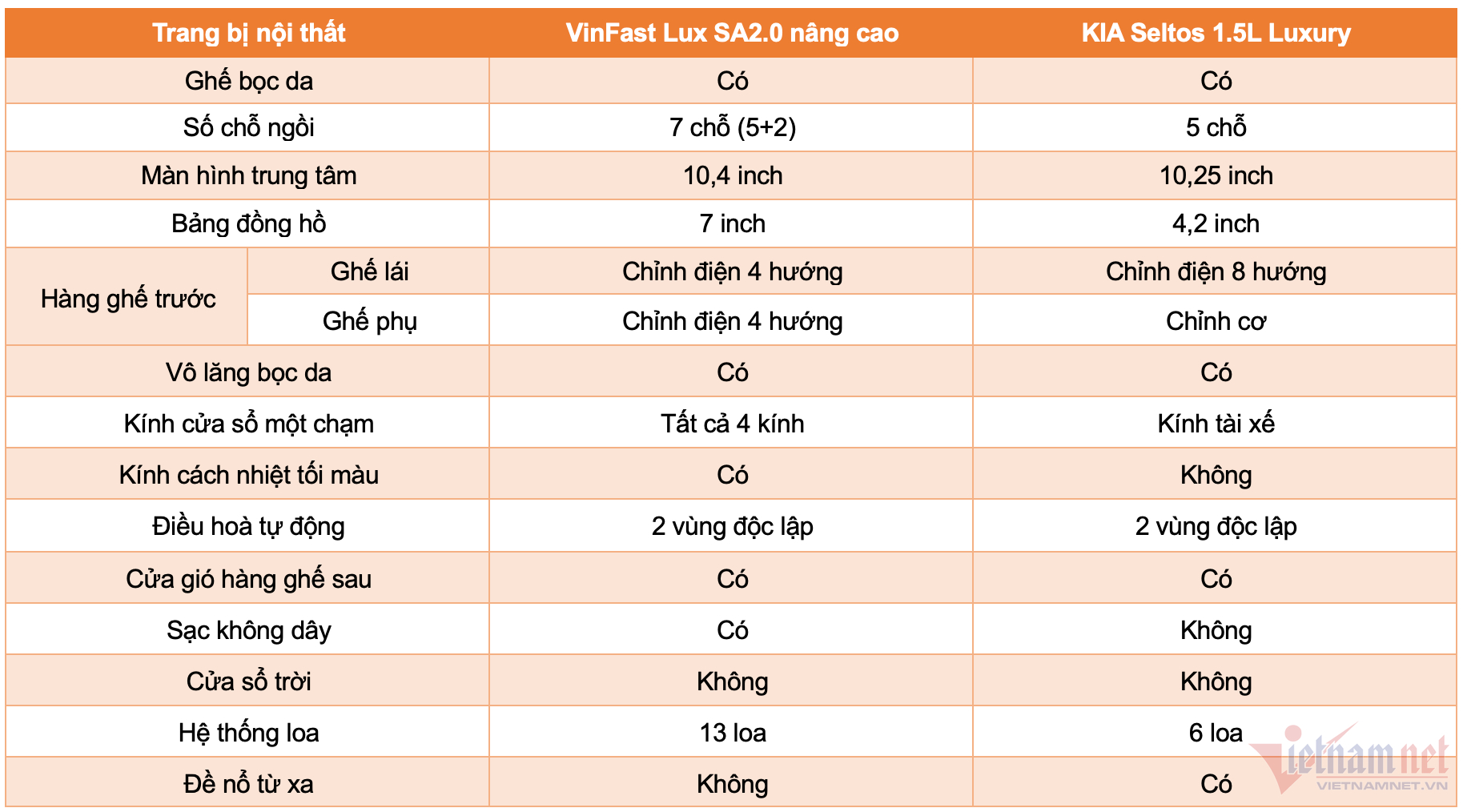 VinFast Lux SA2.0 bản nâng cao có ghế lái và phụ chỉnh điện, sạc không dây, hệ thống 13 loa (KIA Seltos Luxury: 6 loa), kính cửa sổ lên/xuống một chạm và kính cách nhiệt tối màu, giảm nhiệt độ khi trời nắng và tăng tính riêng tư.