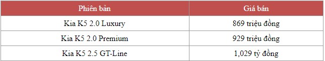 Trong sự kiện sáng 9/10, THACO giới thiệu đồng loạt nhiều xe mới, trong đó có Kia K5. Đây là thế hệ mới của Optima, nhưng đã được đổi tên để đồng bộ với thị trường quốc tế. Xe có tổng cộng 3 phiên bản: 2.0 Luxury, 2.0 Premium và 2.5 GT-Line với giá bán lần lượt 869 triệu đồng, 929 triệu đồng và 1,029 tỷ đồng.