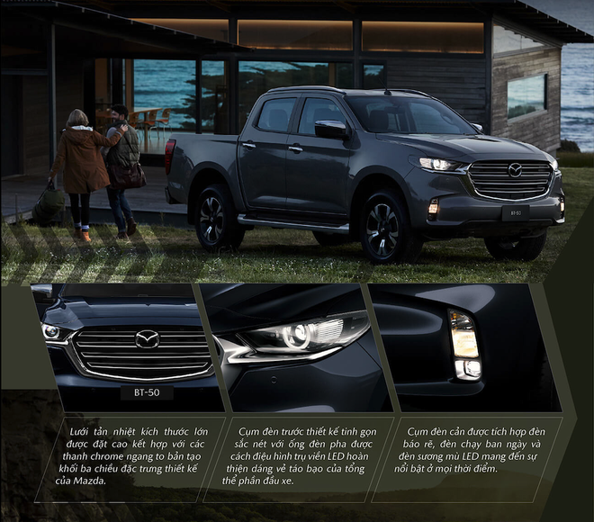 Vẻ ngoài của BT-50 2021 được thiết kế theo ngôn ngữ Kodo giống những dòng xe Mazda thời gian gần đây. Có thể thấy phần đầu trông khá tương đồng tới CX-8 qua lưới tản nhiệt kích thước lớn với những thanh crôm nằm ngang. Đèn pha là loại LED. Cụm đèn ở cản trước tích hợp đèn định vị ban ngày LED, đèn sương mù và đèn xi-nhan. Phiên bản tại Việt Nam được mạ crôm ở tay nắm cửa, gương chiếu hậu và tay mở nắp thùng phía sau. Mâm xe kích thước 18 inch.