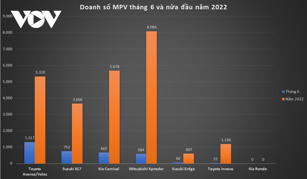Sau nửa đầu năm 2022, Mitsubishi Xpander vẫn là mẫu xe dẫn đầu về doanh số, với 8.084 chiếc bán được, cao gấp rưỡi so với đối thủ xếp ở vị trí liền kề - Kia Carnival với 5.678 chiếc bán ra.