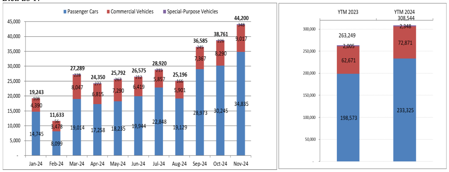 Theo báo cáo bán hàng của Hiệp hội Các nhà sản xuất ô tô Việt Nam (VAMA), thị trường ô tô trong nước năm 2024 đạt đỉnh vào tháng 11 với lượng bán ra 44.200 chiếc, tăng 14% so với tháng 10/2024 (38.761 chiếc) và tăng 58% so với tháng 11/2023 (27.953 chiếc).