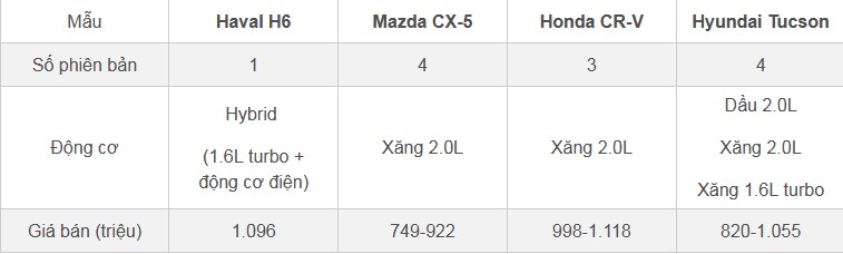 So về giá bán, Haval H6 hybrid đang gần như đắt nhất phân khúc, chỉ đứng sau Honda CR-V phiên bản cao cấp 1.5L nhưng ngược lại, đây là mẫu xe duy nhất trong phân khúc đang sử dụng động cơ lai hybrid.