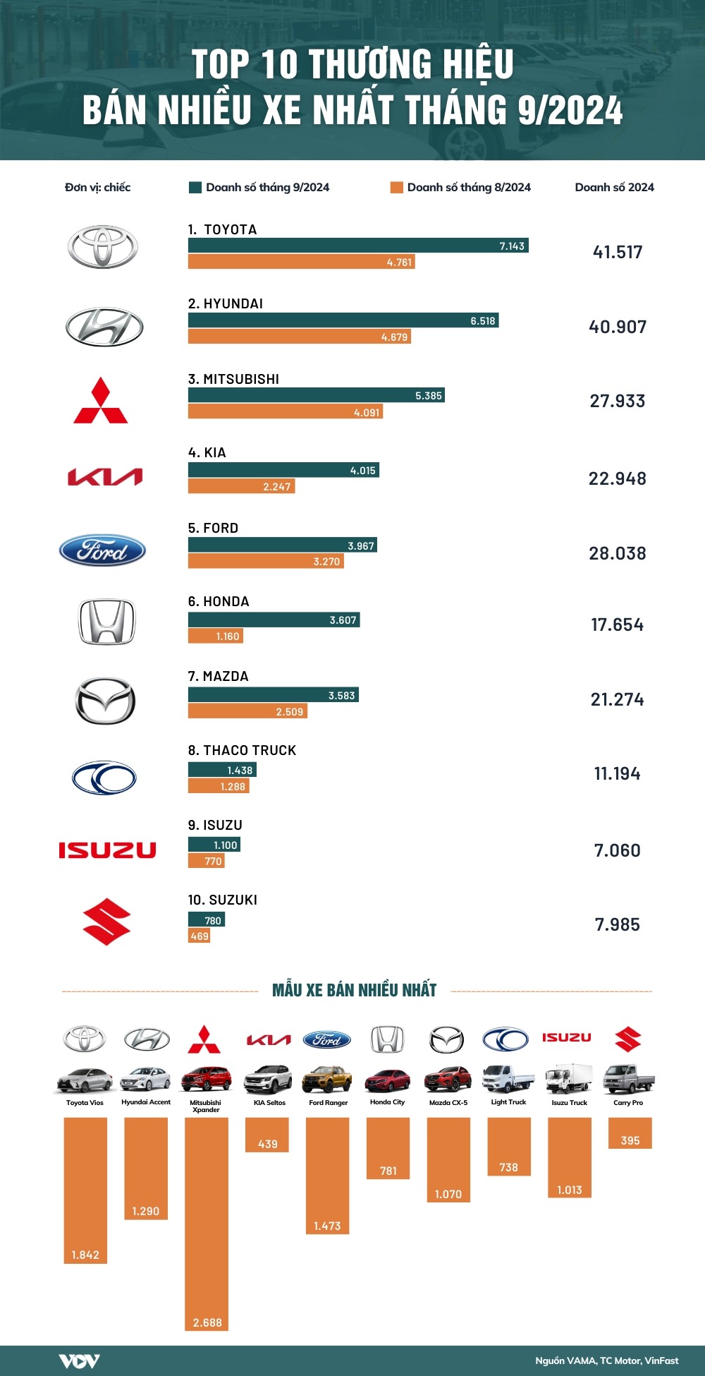 Số liệu cho thấy Toyota là thương hiệu bán được nhiều xe nhất tại Việt Nam trong tháng 9/2024; tiếp theo sau đó là Hyundai, Mitsubishi, Kia,...