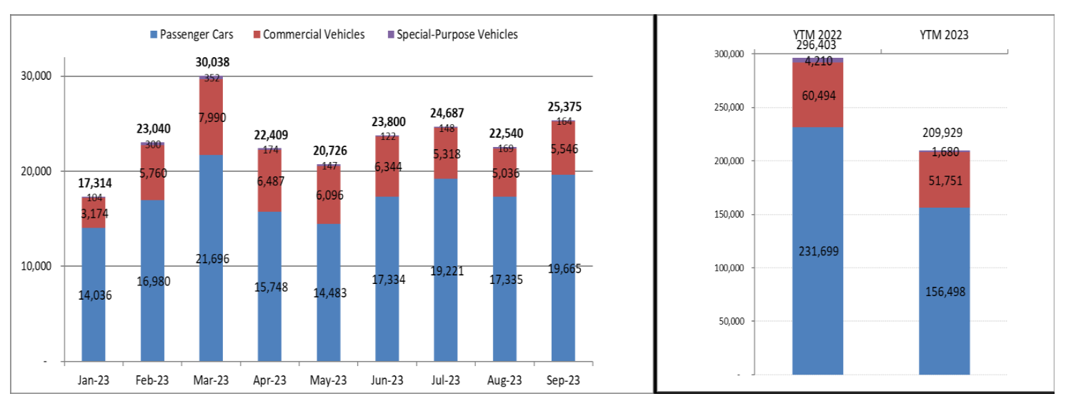 Cụ thể, theo số liệu mới nhất của Hiệp hội các nhà sản xuất ô tô Việt Nam (VAMA) tháng 9/2023, doanh số bán hàng của toàn thị trường là 25.375 xe (tăng 13% so với tháng 8/2023 và giảm 24% so với tháng 9 cùng kỳ năm ngoái). Con số này bao gồm 19.665 xe du lịch (tăng 13%), 5.546 xe thương mại (tăng 10%) và 164 xe chuyên dụng (giảm 3%).