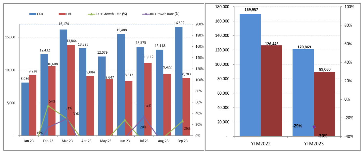 Trong tổng số 25.375 xe đã bán được trong tháng 9 theo báo cáo VAMA, doanh số của xe lắp ráp trong nước đạt 16.592 xe (tăng 26% so với tháng trước) và xe nhập khẩu nguyên chiếc là 8.783 xe (giảm 7%)