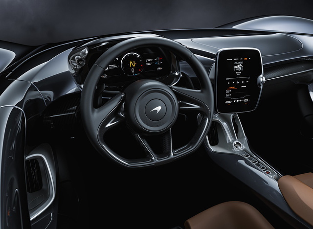 Với việc không có mui, toàn bộ nội thất của chiếc McLaren đều được thiết kế để chống nước, tránh việc hỏng hóc các chi tiết điện tử khi gặp trời mưa. Các trang bị khác trong cabin bao gồm màn cảm ứng 8 inch tại trung tâm táp-lô, màn hình kỹ thuật số sau vô-lăng, điều hòa, loa phục vụ nhu cầu giải trí,…