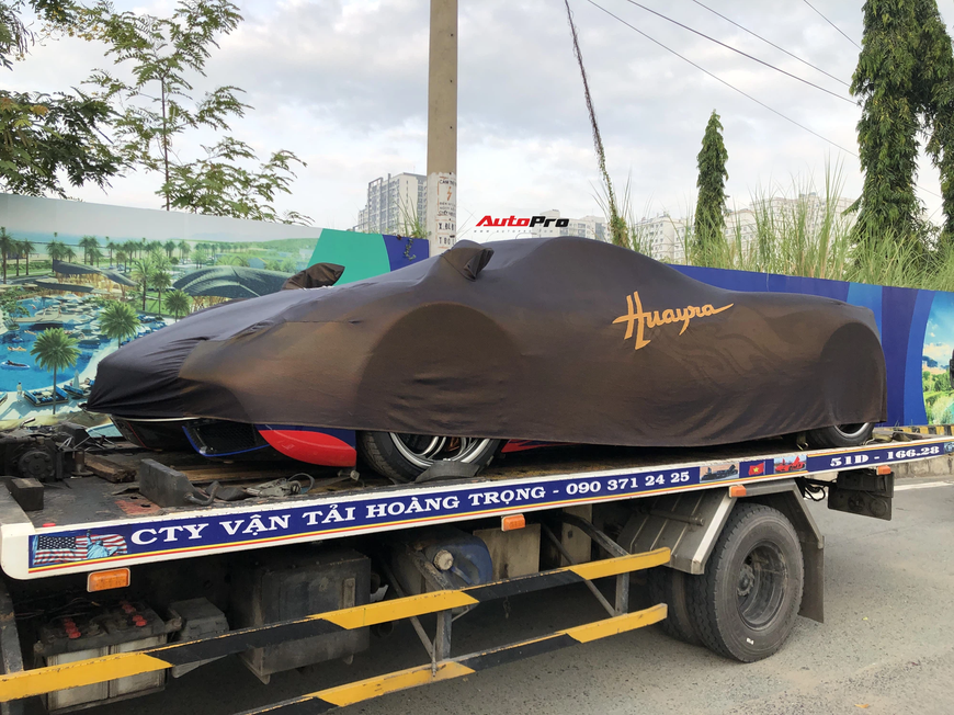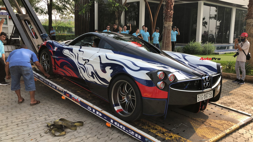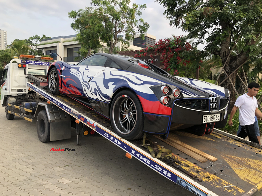 Siêu xe Pagani Huayra bất ngờ di chuyển lên xe chuyên dụng. Doanh nhân Phạm Trần Nhật Minh sẽ cầm lái chiếc Aston Martin V8 Vantage thay vì Huayra như kế hoạch ban đầu.