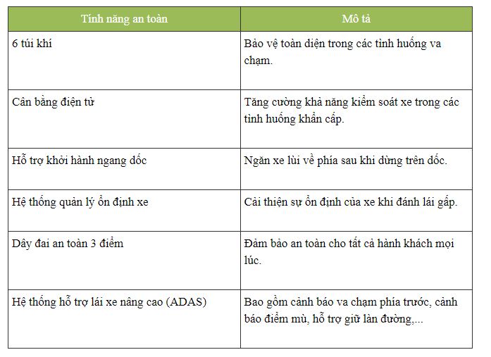 Hệ thống an toàn trên xe được đánh giá cao với 6 túi khí, hỗ trợ khởi hành ngang dốc, cân bằng điện tử và hệ thống quản lý ổn định xe. Bên cạnh đó, xe còn sở hữu hệ thống hỗ trợ lái xe nâng cao ADAS giúp người lái tự tin hơn khi tham gia giao thông. ADAS bao gồm các tính năng như cảnh báo va chạm phía trước, cảnh báo điểm mù, hỗ trợ giữ làn đường,...