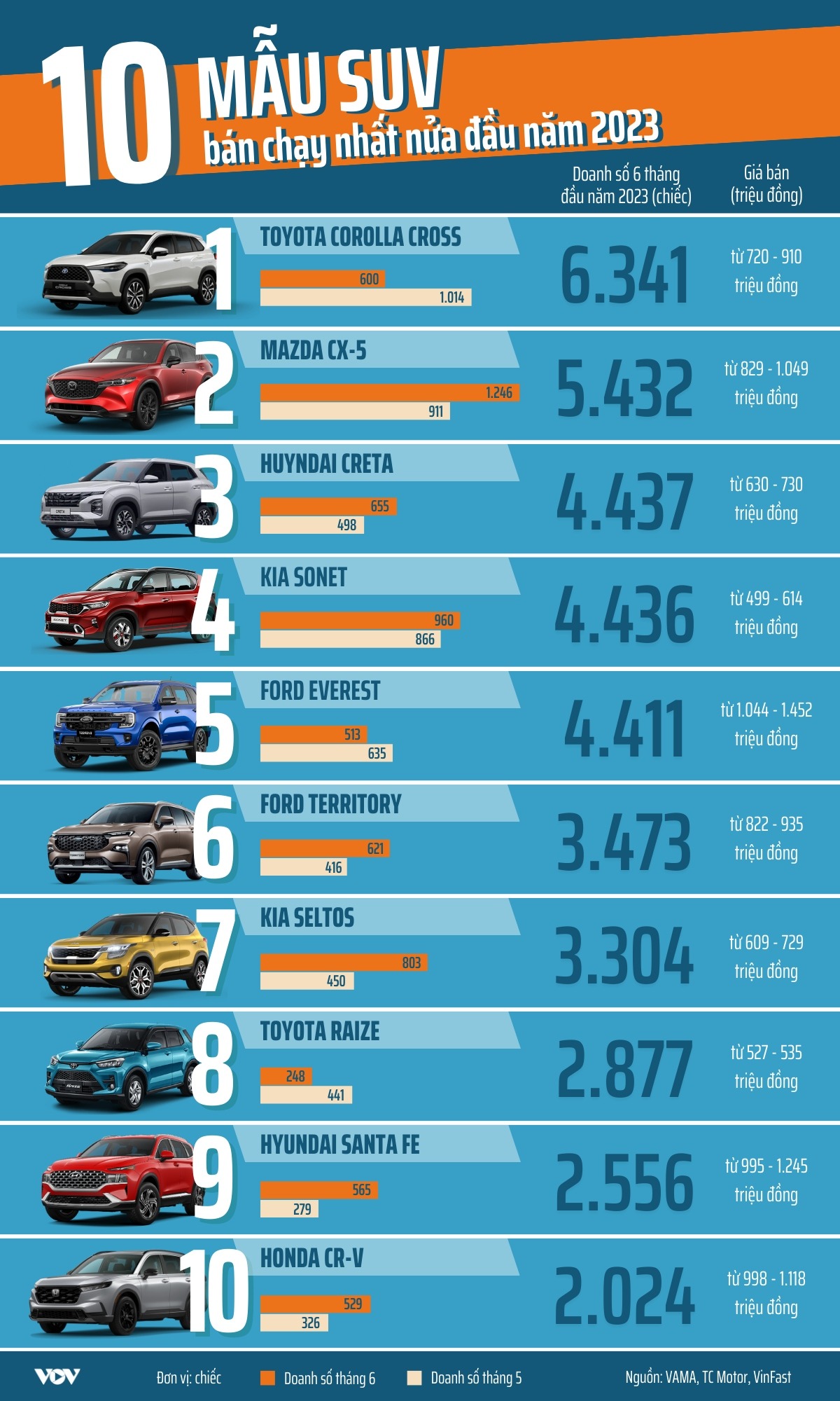 23/07/2023 13:43Top 10 mẫu SUV được người Việt mua nhiều nhất: Toyota Corolla Cross đứng đầu