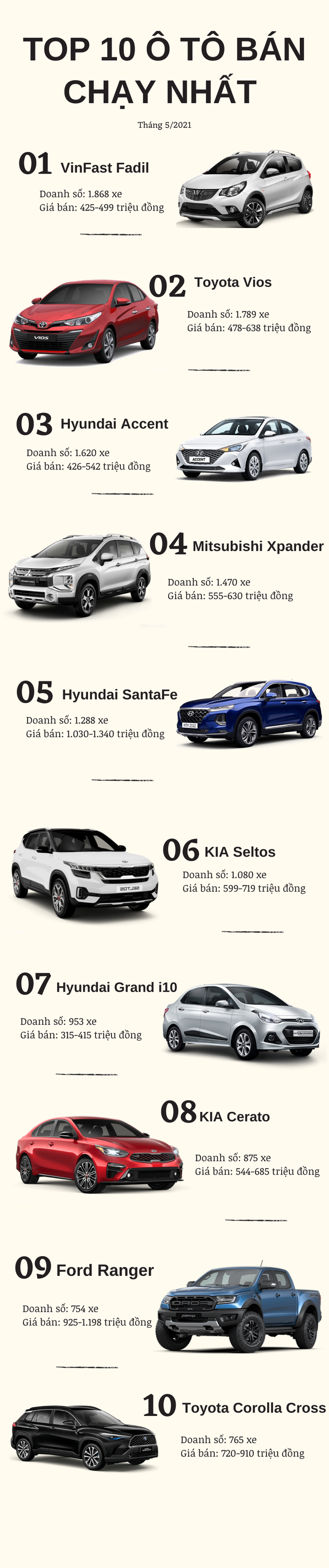 11/06/2021 04:16Top 10 ô tô bán chạy nhất tháng 5/2021: VinFast Fadil bứt phá ngoạn mục