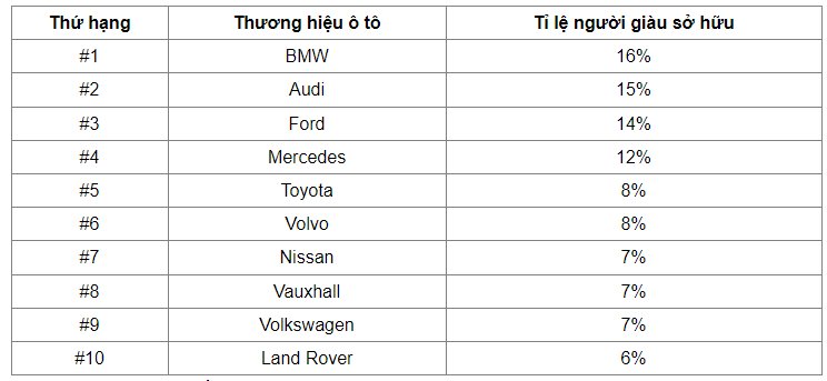 Kết quả khảo sát cho thấy, 16% người thu nhập cao chọn mua xe BMW. Ngoài ra, top 10 xe người giàu thường mua nhất còn có các thương hiệu xe sang như Audi, Mercedes-Benz, Volvo và Land Rover.