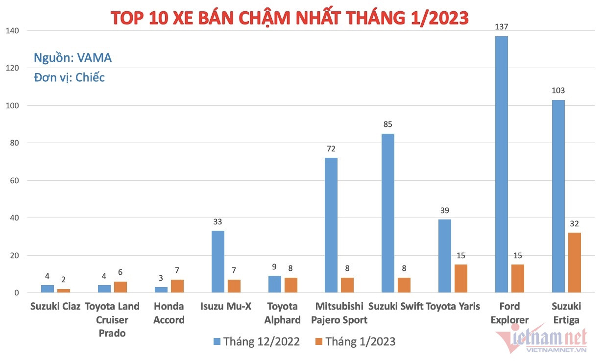 Dưới đây là danh sách 10 mẫu xe bán chậm nhất tháng 1/2023: