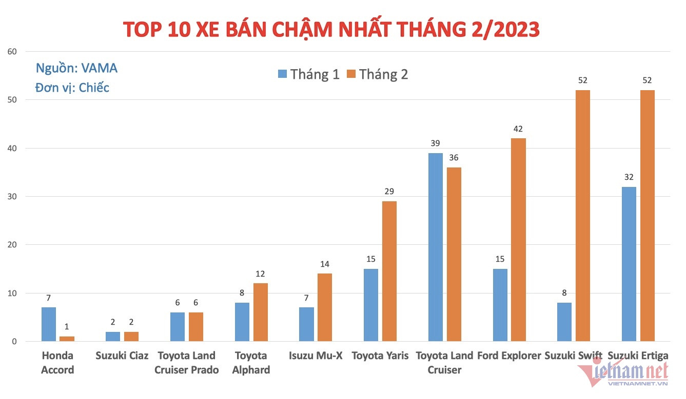 Dưới đây là danh sách 10 mẫu xe bán chậm nhất tháng 2/2023: