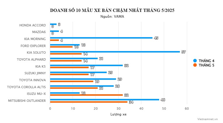 12/06/2025 20:55Top 10 xe bán chậm tháng 5/2025: Honda Accord và Mazda6 đều 'trắng tay' doanh số