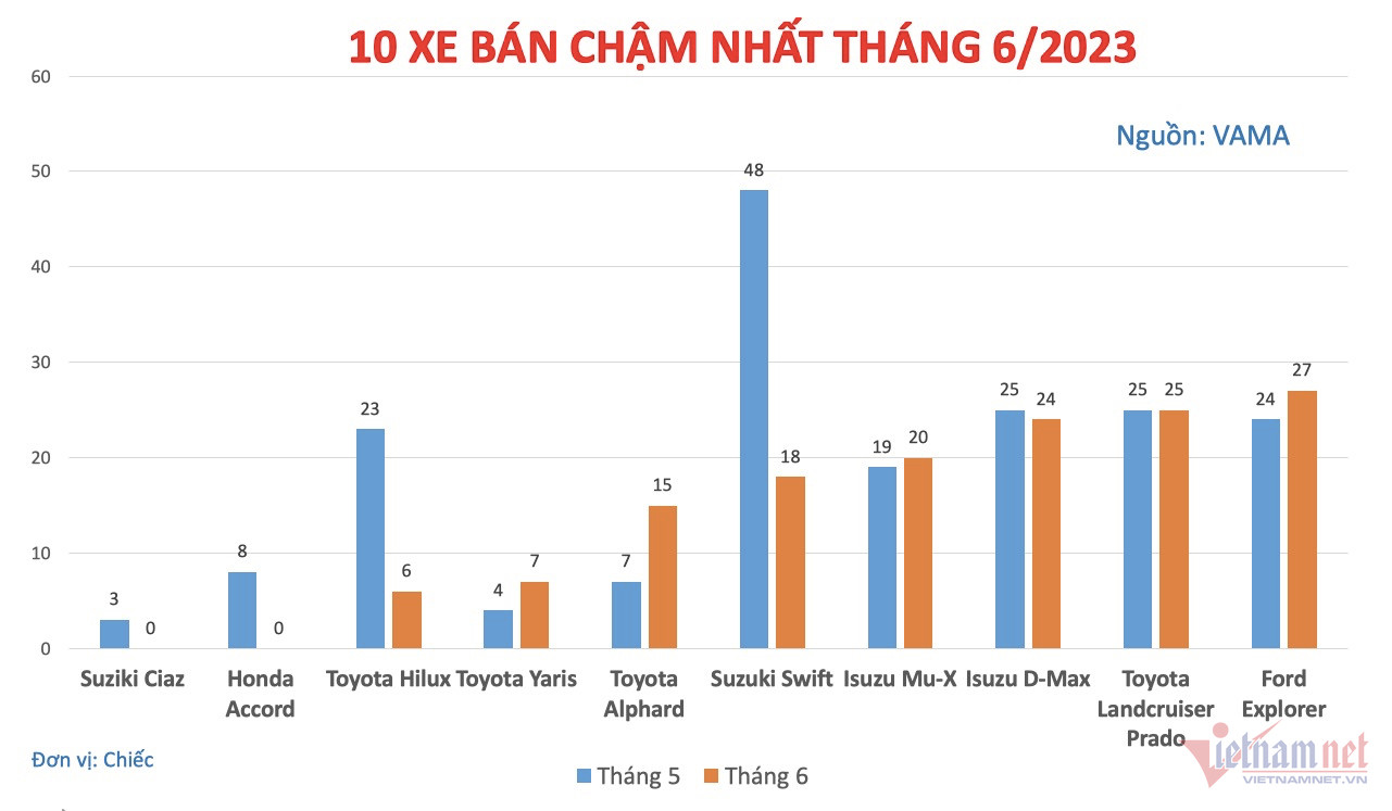 Trong đó, Suzuki Ciaz và Honda Accord gây thất vọng "toàn tập" khi không bán được ra thị trường chiếc nào trong cả tháng. Một mẫu xe khác của Suzuki là Swift cũng quay trở lại top xe bán chậm, đổi chỗ của Mitsubishi Pajero Sport.