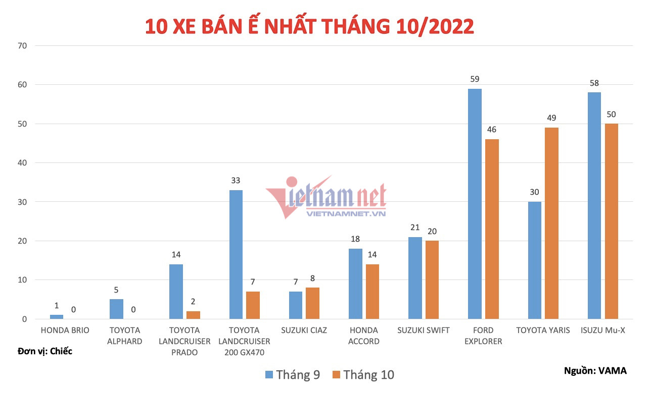 Dưới đây là danh sách 10 mẫu xe bán chậm nhất trong tháng 10 vừa qua.