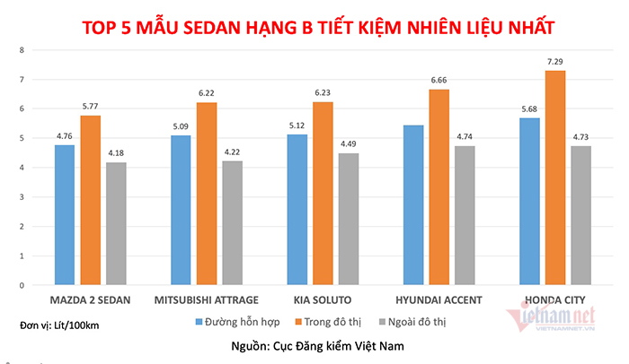 Sedan hạng B là phân khúc khá "chật chội" với trên dưới 10 mẫu xe, đồng thời chiếm tỷ trọng doanh số cao nhất toàn thị trường. Theo Cục Đăng kiểm Việt Nam, nhiều mẫu sedan hạng B có mức tiêu thụ nhiên liệu cực kỳ ấn tượng, thậm chí vượt xa cả những mẫu xe hạng A.