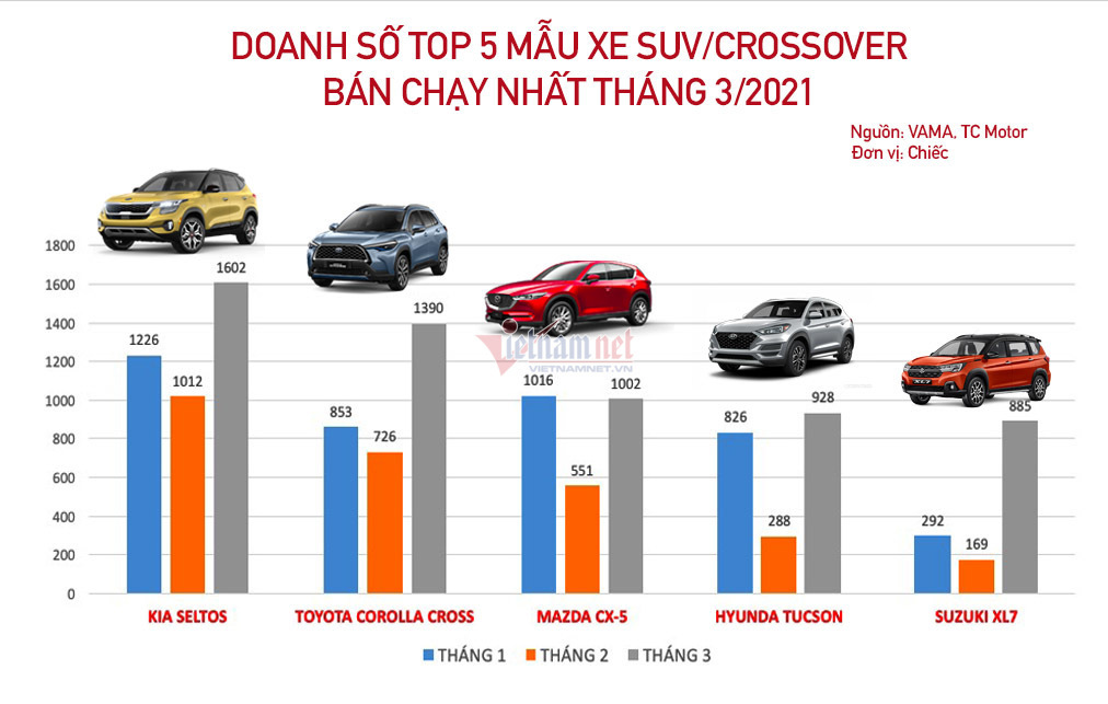 Ngoài ra, doanh số của một số mẫu xe SUV/Crossover đáng chú ý trong tháng 3/2021 như sau: Hyundai SantaFe: 882 chiếc; Ford Everest: 817 chiếc; Toyota Fortuner: 652 chiếc; Honda CR-V: 598 chiếc; KIA Sorento: 498 chiếc; Vinfast LuxSA2.0: 470 chiếc; Toyota Rush: 460 chiếc; Mazda CX-8: 412 chiếc,…
