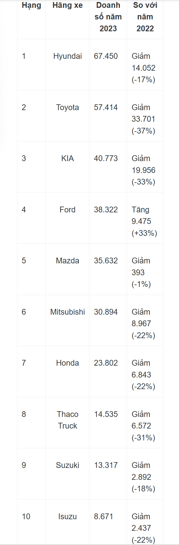 Mặc dù chứng kiến sự sụt giảm doanh số tới 14.052 xe tương đương 17% so với cùng kỳ năm ngoái nhưng Hyundai vẫn bỏ xa đối thủ xếp thứ hai là Toyota khoảng 10.000 xe bán ra.