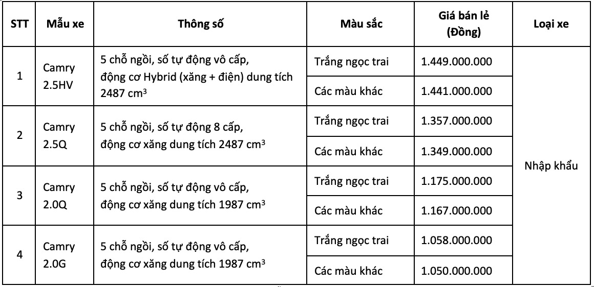 Toyota Camry được phân phối tại thị trường Việt Nam với 04 màu ngoại thất (đen 218, đen 222, đỏ, trắng ngọc trai) và 02 màu nội thất (đen, be).