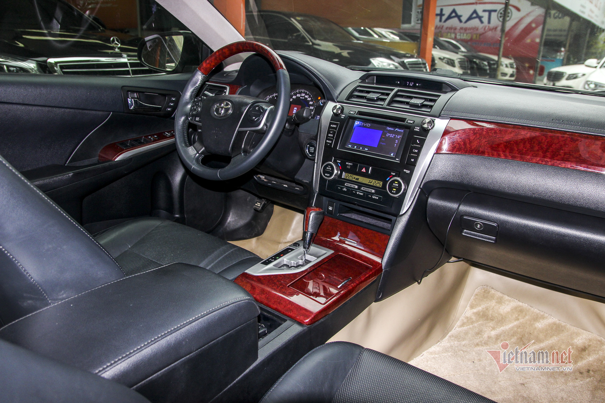 Không gian Toyota Camry 2.5Q 2013 rộng rãi pha chút cổ điển. Ghế da màu đen, bảng taplo và vô lăng ốp gỗ, ghế lái nhớ 2 vị trí, vô lăng 4 chấu tích hợp nhiều phím chức năng như đàm thoại rảnh tay, tăng giảm âm lượng, gương chiếu hậu chỉnh, màn hình giải trí 6.2 inch giao diện đơn giản. Đời xe 2013 vẫn còn đầu đọc đĩa CD, hơi lạc lõng so với hiện tại. Tuy nhiên, người mua dễ dàng khắc phục bằng cách thay thế đầu Android.