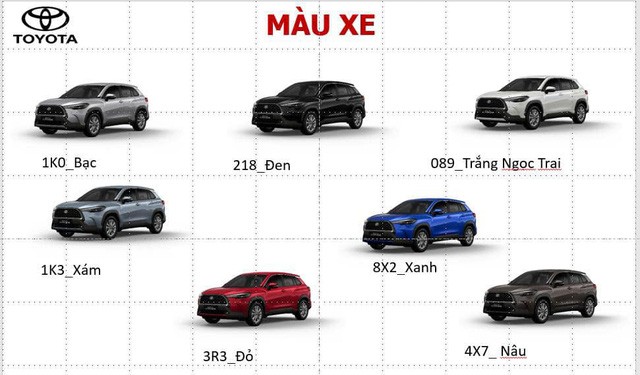 Có 7 màu sơn cho Corolla Cross tại Việt Nam. Trong đó, 3 màu sặc sỡ nhất là xanh nước biển, xanh xám và đỏ. Xe còn có các màu nâu, đen, bạc và trắng.