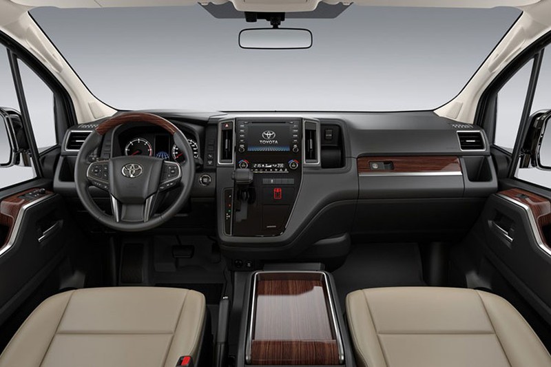 Bên trong khoang nội thất, Granvia được trang bị vô-lăng dạng 3 chấu tích hợp nhiều nút bấm điều chỉnh nhanh. Khu vực chính giữa là một màn hình giải trí trung tâm kích thước 7 inch, kết hợp với hệ thống âm thanh 12 loa.