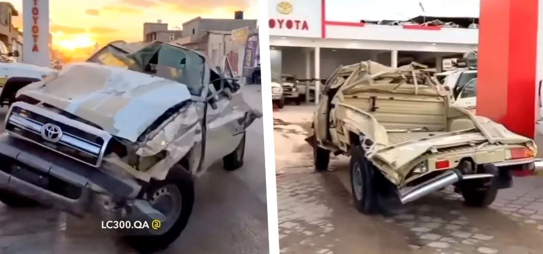 Toàn bộ ngoại thất của xe Toyota Land Cruiser tai nạn đều hư hỏng nặng, thậm chí tài xế còn vừa phải lái xe vừa giữ cánh cửa để khỏi bị bung ra. Tuy nhiên, hệ khung thang rời và hệ thống truyền động của xe không bị ảnh hưởng nhiều nên tài xế vẫn có thể lái xe về đại lý.