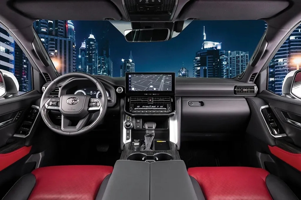 Không gian nội thất của Toyota Land Cruiser 300 Hybrid vẫn giữ nguyên thiết kế sang trọng và hiện đại với màn hình hiển thị lái xe kỹ thuật số 12,3 inch, hệ thống thông tin giải trí cũng 12,3 inch tích hợp phần mềm mới, hệ thống âm thanh JBL 14 loa, Toyota Safety Sense 3.0 và lựa chọn nội thất hai tông màu đen/đỏ. Hãng xe Nhật Bản cho biết hệ thống an toàn Toyota Safety Sense trên Land Cruiser 300 HEV chưa phải là phiên bản mới nhất 3.0+ đã có trên mẫu nâng cấp ở Nhật Bản. Ngoài ra, xe vẫn giữ nguyên cần số truyền thống thay vì cần số điện tử như trên Lexus LX700h, không có lẫy chuyển số sau vô lăng.