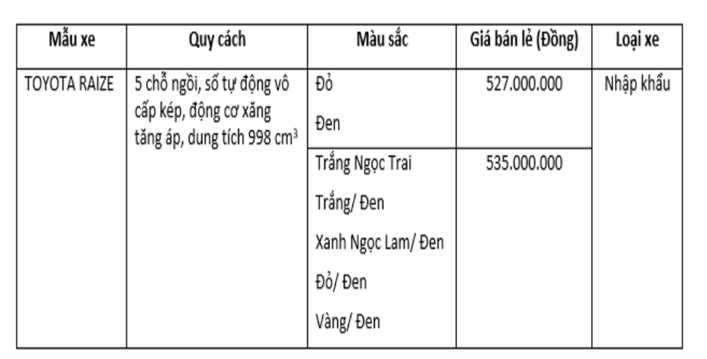 Toyota Raize được phân phối với 7 màu sắc, mẫu xe này sẽ có mặt tại các Đại lý Toyota trên toàn quốc dự kiến từ ngày 20/11/2021 với mức giá như sau: