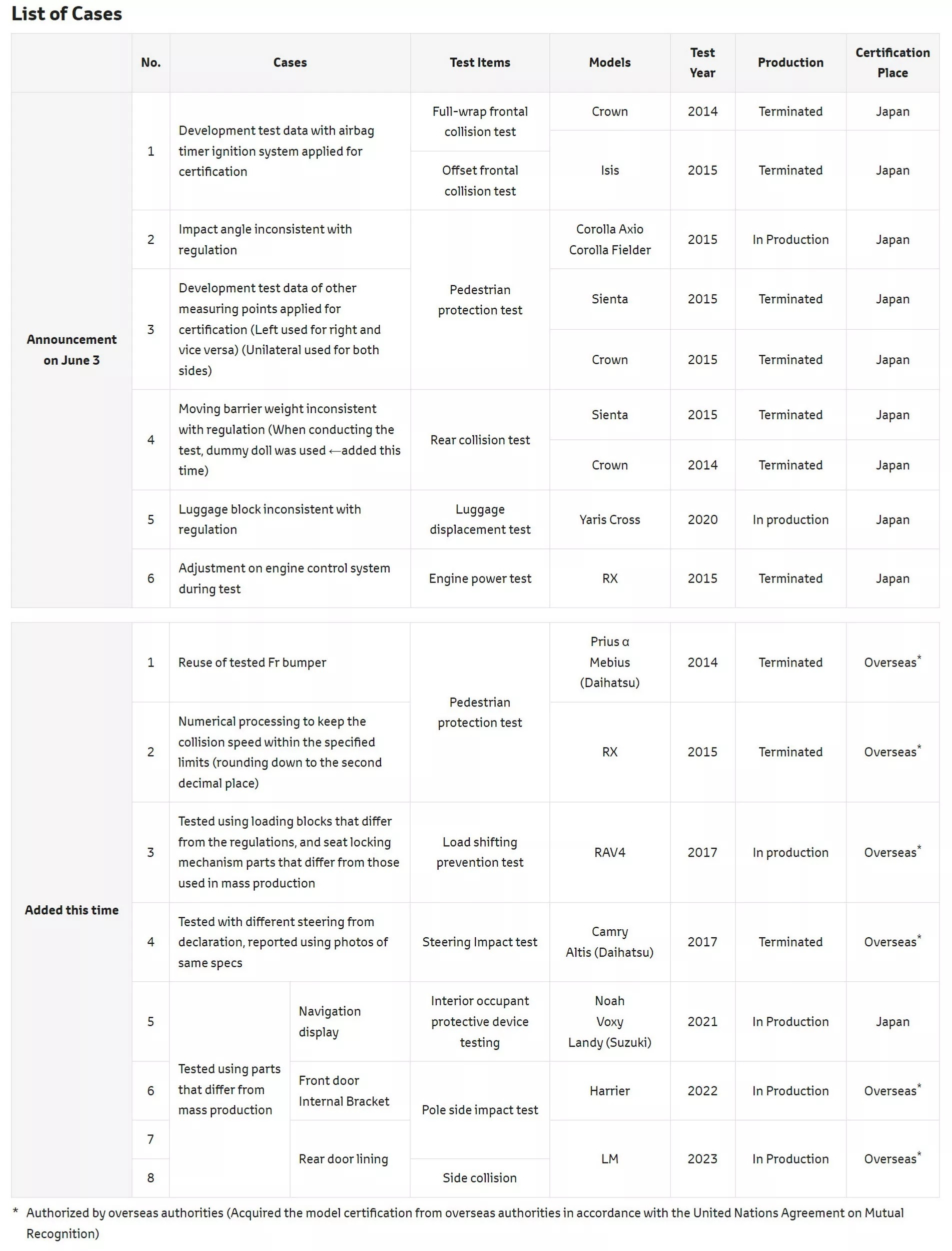 Vì nhiều mẫu xe nằm trong diện gian lận thử nghiệm an toàn đã được sản xuất cho thị trường quốc tế hoặc đã bị ngừng sản xuất, Toyota khẳng định rằng các chủ xe hiện tại "không cần phải ngừng sử dụng chúng". Tuy nhiên, việc sản xuất và giao hàng của các mẫu minivan Noah và Voxy - đang bán tại thị trường Nhật Bản - đã bị dừng từ ngày 29/7.