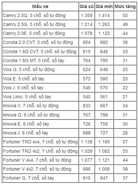 Theo đó, ở dòng Toyota, chỉ có Hilux, Land Cruiser và Prado giữ nguyên giá như hiện tại, còn lại đều tăng giá. Trong đó tùy từng phiên bản, Camry tăng nhiều nhất 55 triệu, Fortuner tăng nhiều nhất 57 triệu Altis tới 38 triệu và Innova cũng là 34 triệu, Vios tăng 25 triệu.