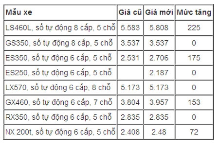 Ở thương hiệu xe sang Lexus, Toyota tăng giá 4 trong tổng số 8 sản phẩm bán tại Việt Nam. Cụ thể, LS460 tăng 225 triệu, ES350 tăng 175 triệu, GX460 tăng 153 triệu và chiếc crossover cỡ nhỏ mới NX200t cũng tăng tới 72 triệu.