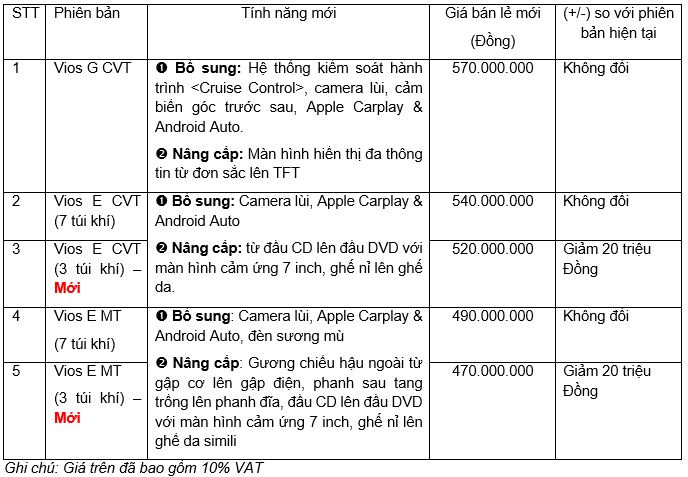 Cụ thể, Toyota Vios sẽ được bán ra với 5 phiên bản khác nhau gồm Vios G CVT, Vios E CVT (7 túi khí), Vios E CVT (3 túi khí- phiên bản mới), Vios E MT ( 7 túi khí) và Vios E MT (3 túi khí- phiên bản mới). Trong đó, hai phiên bản mới đã bị cắt giảm túi khí để có giá thành tốt hơn, bao gồm Vios E CVT túi khí có giá 520 triệu đồng, rẻ hơn 20 triệu đồng so với phiên bản 7 túi khí và E MT 3 túi khí có giá 470 triệu đồng.