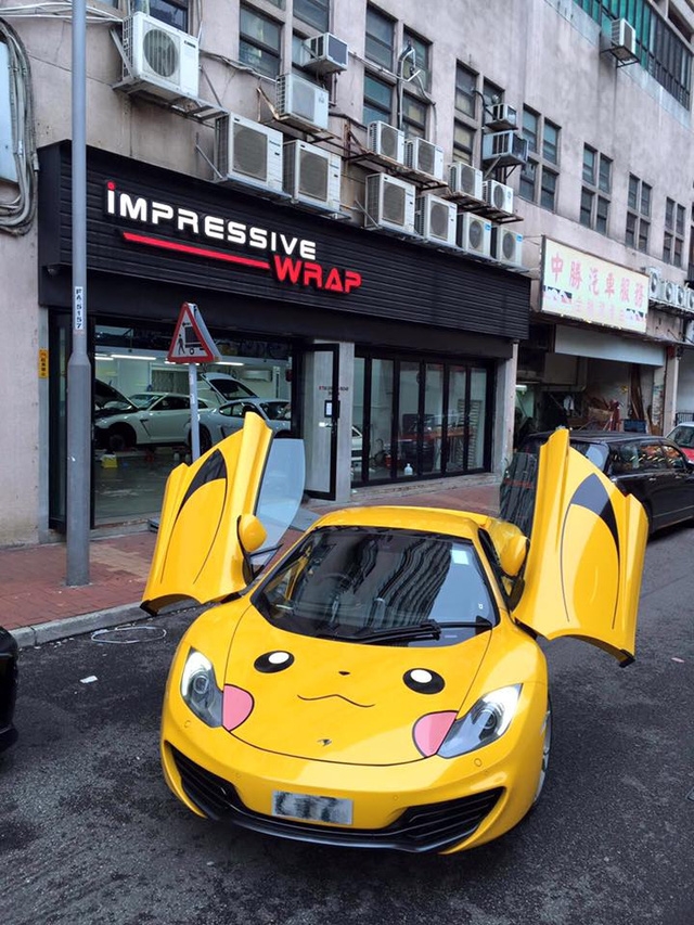 | Chiếc siêu xe McLaren 12C dán hình Pikachu đỗ bên ngoài trụ sở công ty Impressive Wrap. |