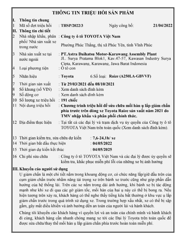 Theo đó, sẽ có 191 chiếc Toyota Raize (số loại A250LA-GBVVF) có thời gian sản xuất từ 29/3/2021 đến 8/10/2021 sẽ phải triệu hồi để sửa chữa mối hàn ụ lắp giảm xóc phía trước. Tuy nhiên TMV không công bố cụ thể vị trí nào ở giảm xóc trước hay bị cả hai bên.
