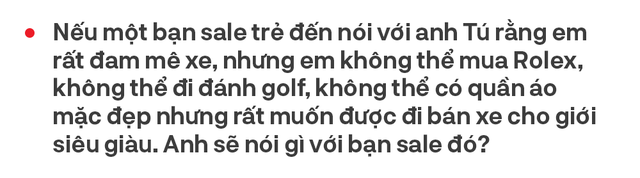 Mình không phủ nhận những tác động tích cực của việc trải nghiệm và sở hữu những đồ dùng xa xỉ. Nhưng thực tế, mình bán những chiếc siêu xe đầu tiên khi trên tay chưa đeo Rolex và cũng chưa từng thực hiện cú swing nào. Bản chất của việc bán siêu xe, xe siêu sang không nằm ở những thứ xa hoa đó, cốt lõi vẫn phải ở chính mình. Giới siêu giàu họ có tri thức và đủ trí tuệ để nhìn ra nếu bạn là một người bán hàng có nhiệt huyết, có đam mê và có mong muốn đem lại lợi ích cho họ.