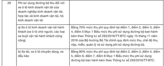 Cụ thể, xe ô tô kinh doanh vận tải hành khách (xe ô tô chở người, các loại xe buýt vận tải hành khách công cộng) sẽ có mức phí đường bộ bằng 70% mức thu phí quy định tại điểm 1, điểm 2, điểm 3, điểm 4, điểm 5 Mục 1 Biểu mức thu phí sử dụng đường bộ ban hành kèm theo Thông tư số 293/2016/TT-BTC ngày 15 tháng 11 năm 2016 của Bộ trưởng Bộ Tài chính.