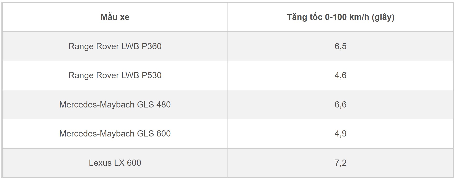 Nếu so với các đối thủ như Mercedes-Maybach GLS 480 có cùng kiểu máy I6 3.0L và mô men xoắn 500 Nm, công suất của Range Rover P360 vẫn kém hơn chút ít (17 mã lực). Trong khi với Lexus LX 600, mẫu xe của Land Rover yếu thế hơn đáng kể, kém 54 mã lực và 150 Nm do đối thủ dùng máy lớn hơn V6 3.5L Turbo kép.