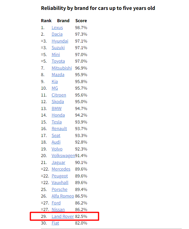 Mặc dù Range Rover là một chiếc SUV mang tính biểu tượng của thương hiệu xe địa hình Anh Quốc nhưng nó không thoát khỏi sự thật rằng độ tin cậy của Range Rover chỉ xếp ở mức trung bình theo khảo sát tại của một số trang đánh giá xe có uy tín như WhatCar (Anh) hay US Ranking (Mỹ).