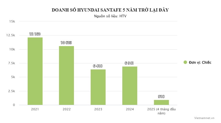 Trong 4 tháng đầu năm 2025 vừa qua, Liên doanh ô tô Hyundai Thành Công Việt Nam (HTV) chỉ bán ra được 918 chiếc Hyundai Santa Fe, trung bình đạt chưa tới 230 chiếc/tháng.