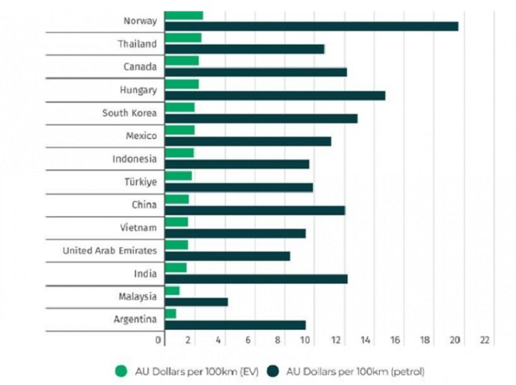 Kết quả khảo sát cho thấy, Việt Nam xếp hạng rẻ thứ 5 trong số các quốc gia khảo sát với chi phí sạc ôtô điện chỉ 1,55 AUD ( khoảng 24.000 đồng)/100 km. Với cùng quãng đường 100km, ôtô điện chỉ mất khoảng 24.000 đồng cho phí nhiên liệu trong khi xe chạy xăng mất đến khoảng 145.000 đồng (9,38 AUD).