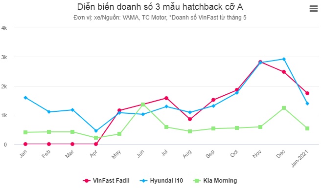 Tháng 1/2021, Fadil dẫn đầu phân khúc hatchback cỡ A với 1.746 xe tiêu thụ. Hyundai i10 xếp thứ hai, bán 1.393 xe. Trước đó vào 2020, tổng lượng bán ra của Fadil đạt 18.016 xe, nhỉnh hơn 447 xe so với i10. Đây là lần đầu tiên trong 5 năm qua, ngôi vương phân khúc này không thuộc một trong hai thương hiệu Hàn Quốc là Hyundai và Kia.